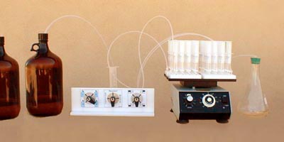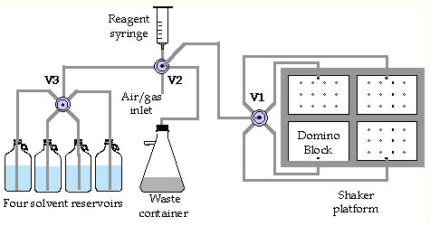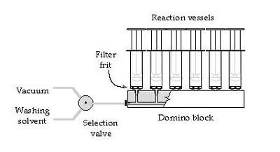 The concept of liquid exchange is based on a simple principle. At first, a single outlet reaction vessels (e.g. a plastic syringes), loaded with resin, are connected to an evacuated waste container. The difference in pressure between the reaction vessel (atmospheric pressure) and the evacuated waste container draws the liquid from the reaction vessel into the waste container and creates a vacuum inside the reaction vessel. The evacuated reaction vessels are then connected to a solvent reservoir. The pressure difference causes the evacuated reaction vessels to be filled with the solvent from the reservoir. The role of the Domino Block is to enable the liquid exchange in a number of reaction vessels at the same time. |