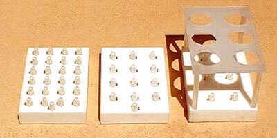 The Domino Block is Teflon-made liquid distribution manifold (footprint of a standard 96-well plate) that connects all reaction vessels to one common port of a distribution valve. This common port is used to introduce and remove the solvent. Plastic polypropylene syringes equipped with a porous disk at the bottom are used as reaction vessels. The syringes, charged with resin, are attached via a male Luer fitting to the Domino Block arrayed with a female Luer lock fittings. Three different Domino Blocks are available. Domino Blocks for 24 syringes (4 rows of 6 syringes) accommodate 2.5 and 5 mL syringes, Domino Blocks for 12 syringes (3 rows of 4 syringes) accommodate syringe size up to 20 mL amd Domino Blocks for 6 syringes (2 rows of 3 syringes) designed for 50 mL syringes. This Domino Block has a special holder to prevent losing syringes during shaking. |