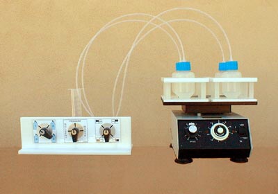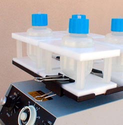 The synthesizer La Marast consists of four reaction vessels (please, specify the size) with caps including fritted cylinders, four reaction vessel holders, a stand with three Teflon valves, and connecting Teflon tubing. The reaction vessel includes cap with fitting, fritted cylinder, and Teflon tubing. Simple clamps are used to secure the position of a holder on the shaker platform (see picture). |