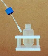 Conical centrifuge tubes with volume 100 mL, 200-mL, and 450-mL serve as reaction vessels (see the Picture). Single outlet reaction vessels of three sizes handle from 3 to 30 g of resin. The female Luer bulkhead fitting with external thread was attached to the cap. Teflon tubing 1/8" connected the fitting with the porous polypropylene cylinder. The reaction vessels were placed into custom made holders (high density polyethylene). The footprint of holders matched the standard 96-well plate. This allowed using commercially available plate shakers rather that a special custom build shaker. |