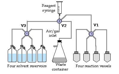 In order to operate the La Marast synthesizer with four reaction vessels a panel with three four-port distribution Teflon valves was used (see Scheme). Four reaction vessels were connected using Teflon 1/8" tubing with four ports of the V1 valve. The common port of the V1 valve was connected to the common port of the four-port V2 valve. The port on the right hand side was connected to the evacuated waste container. Empty syringe was attached to the upper port of the V2 valve. The lower port was left empty. The left hand side port was connected to the common port of the V3 valve. The four ports of this V3 valve were connected to four reservoirs with solvents. All connections and vetted parts of valves were made of Teflon. The disposable reaction vessels were made of polypropylene. If dictated by a chemical protocol, Teflon made reaction vessel was used. |