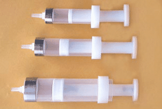 Teflon syringes can replace polypropylene syringes used as the simplest reaction vessels for solid-phase synthesis. Teflon syringe for solid-phase synthesis includes additional PP porous disc at the bottom of the barrel and HDPE locking ring that secures position of the piston during synthesis. |
